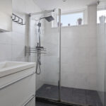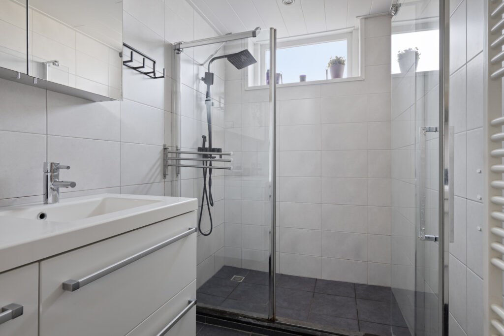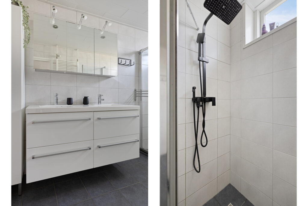 De badkamer op de begane grond is verrassend ruim. De volledig betegelde afwerking, het dubbele wastafelmeubel en de royale inloopdouche zorgen voor veel comfort en gebruiksgemak.