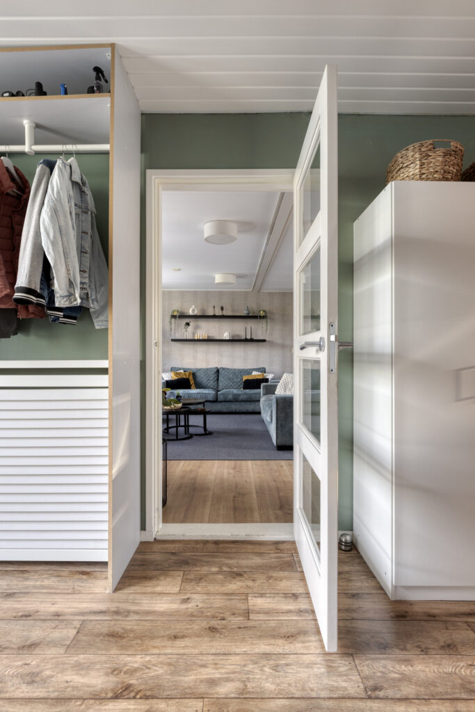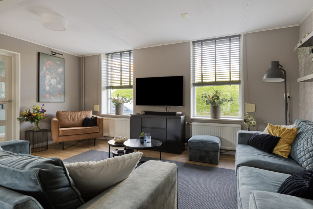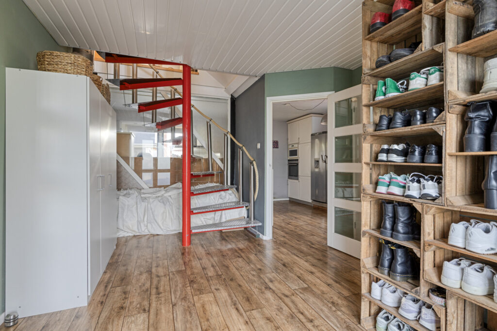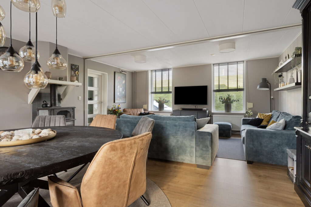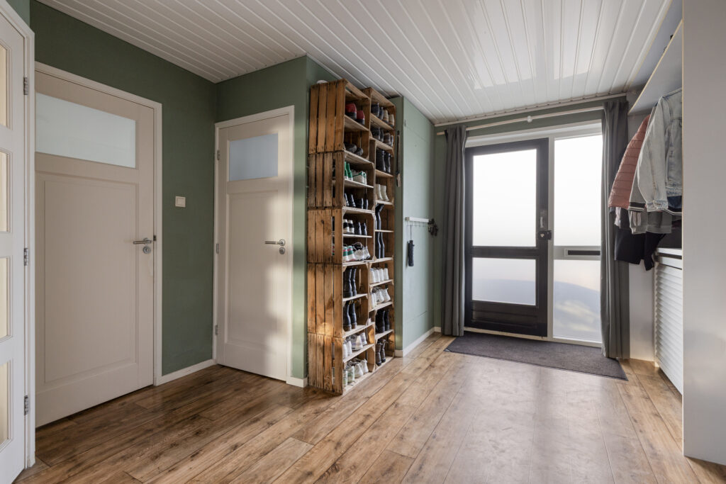 Bij binnenkomst stap je de ruime hal binnen waar je direct het gevoel van overzicht en comfort ervaart. Vanuit de hal bereik je de lichte doorzonwoonkamer. De grote ramen zorgen voor veel daglicht en de openslaande tuindeur verbindt binnen en buiten op een fijne manier. De laminaatvloer en de prettige indeling geven je woonkamer een warme en praktische basis.