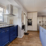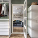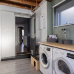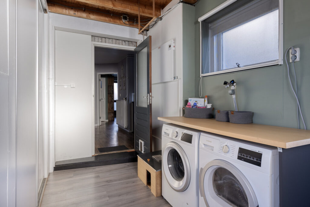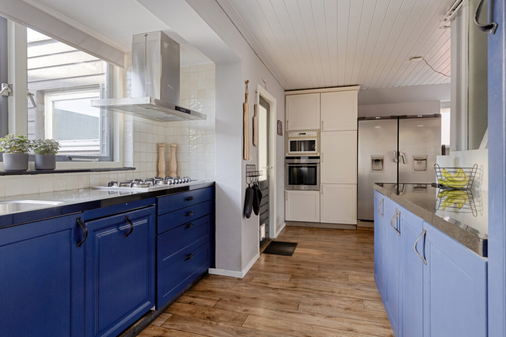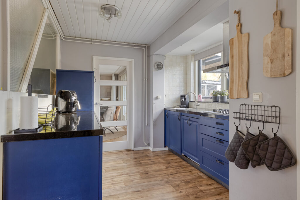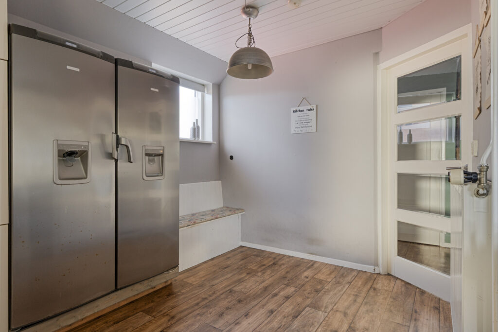 De keuken, in een dubbele rechte opstelling, biedt je volop werk- én opbergruimte. Je kookt hier met gemak voor een groot gezin of uitgebreide etentjes. Vanuit de keuken loop je door naar de bijkeuken met witgoedaansluitingen, een vaste kast en twee buitendeuren: één naar de straat en één naar de achtertuin. Dat maakt dit een perfecte praktische ruimte.