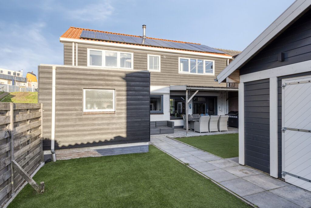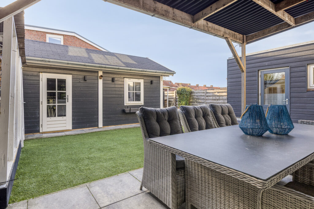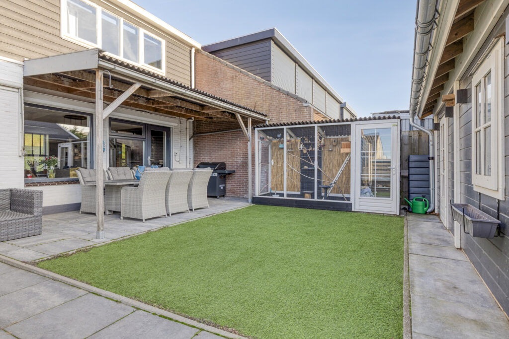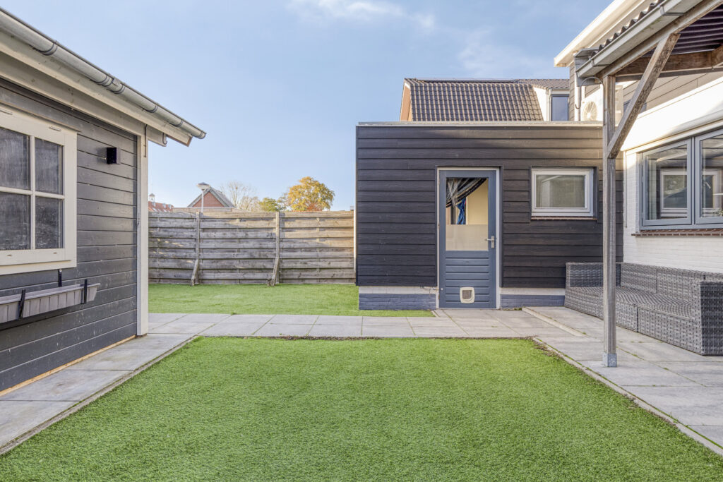 De achtertuin is een echte plus. Je geniet hier van veel privacy, een goede bezonning en voldoende plek om te ontspannen. De tuin heeft kunstgras, een terras, een overkapping en een houthok. De grote schuur met openslaande deuren én een aparte loopdeur biedt meer dan genoeg ruimte voor fietsen, motoren, gereedschap of opslag. Via de achterom bereik je de tuin eenvoudig.