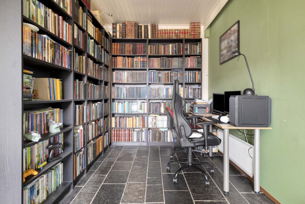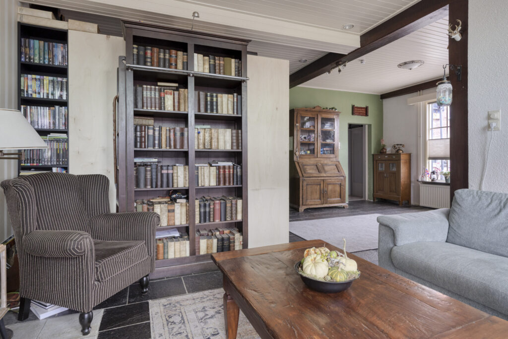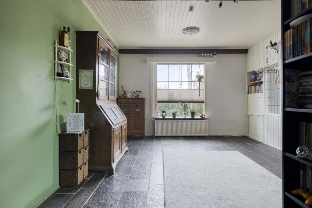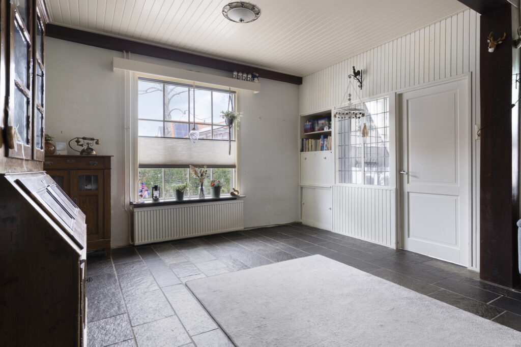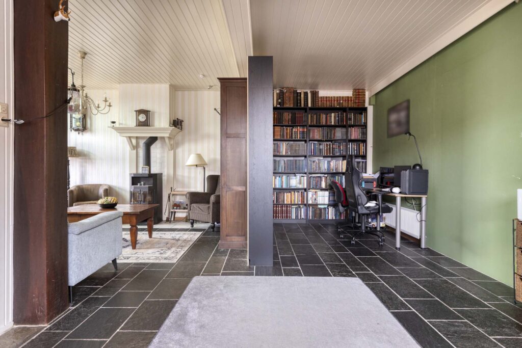 Bij binnenkomst valt meteen de heerlijk lichte en ruime woonkamer op. De combinatie van de marmeren vloer, de klassieke ramen en de gezellige houtkachel geeft de ruimte een fijne uitstraling. Het is een woonkamer waar je je moeiteloos een ontspannen winteravond kunt voorstellen, met de kachel zachtjes brandend en ruimte voor een grote eettafel voor gezellige diners. LET OP! DE SCHEIDENDE MUUR TUSSEN DE ZITHOEK EN DE COMPUTERHOEK KAN CONSTRUCTIEF WEGGENOMEN WORDEN.