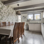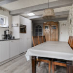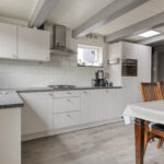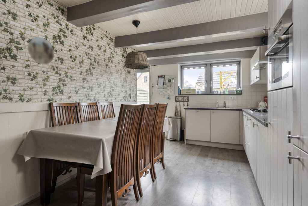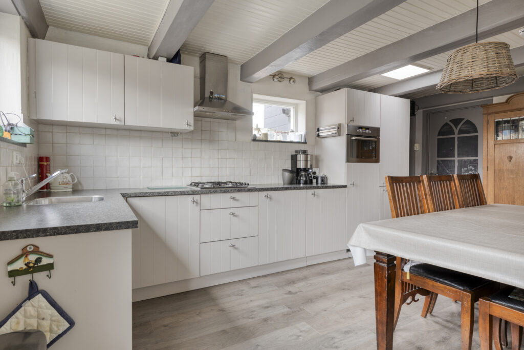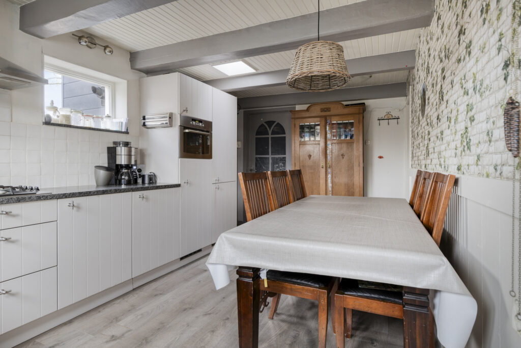 De keuken is praktisch ingedeeld en biedt alle ruimte om uitgebreid te koken. Dankzij de vele kasten en het grote werkblad is dit een fijne plek om te koken terwijl het gezinsleven zich om je heen afspeelt. De indeling maakt het bovendien gemakkelijk om de keuken — indien gewenst — te moderniseren of open te breken tot een royale leefkeuken.