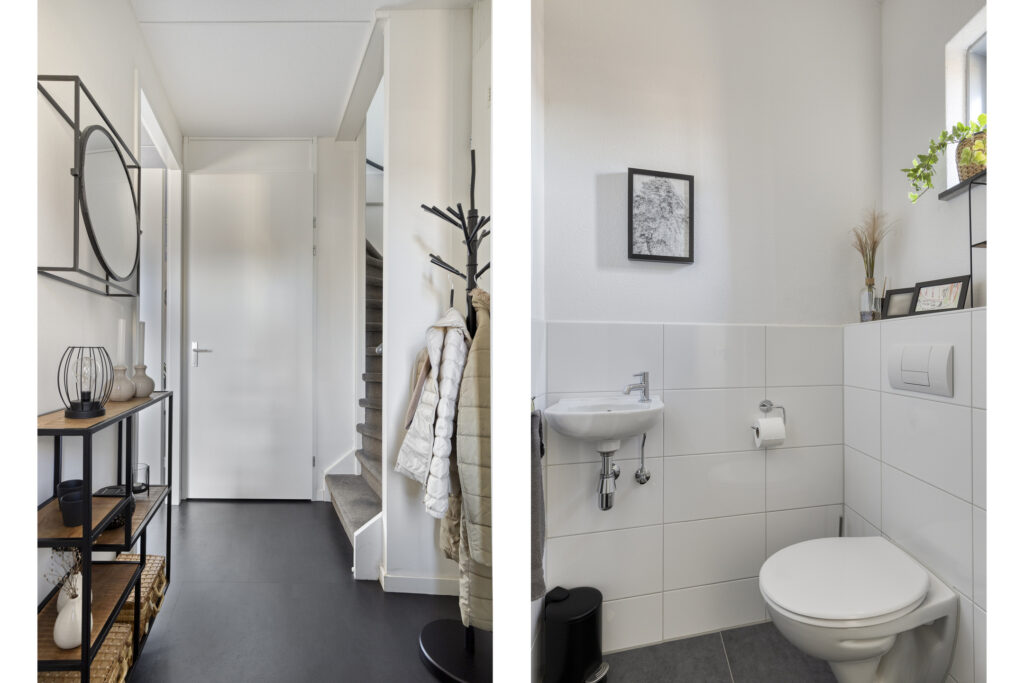Wanneer je binnenstapt, merk je meteen hoe goed de woning is onderhouden. De hal biedt toegang tot het toilet, een ruime trapkast en de trap naar boven.