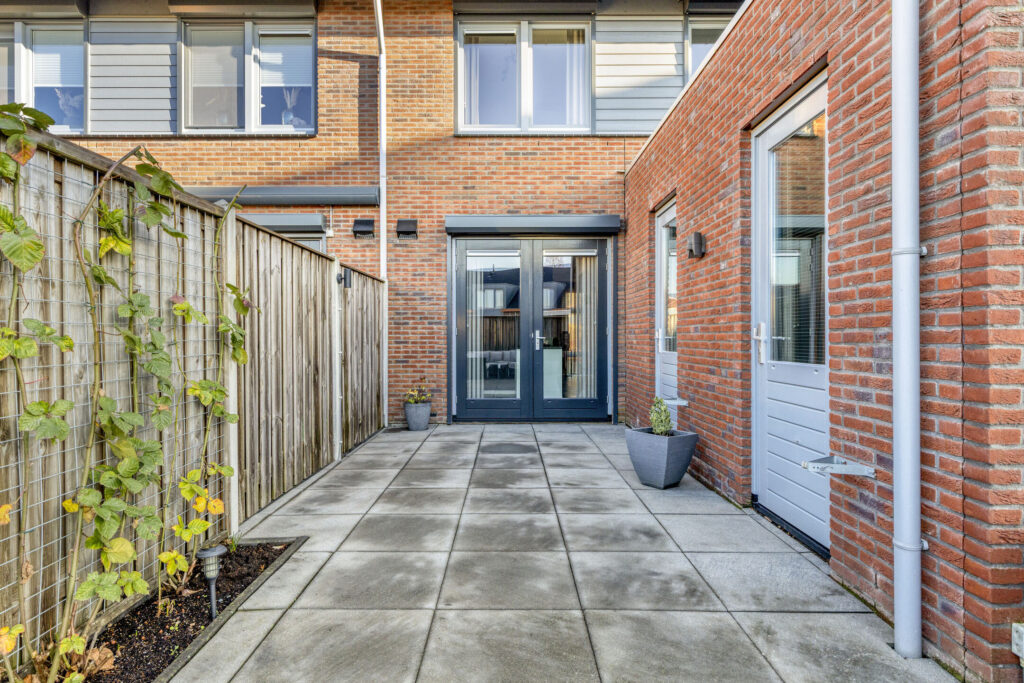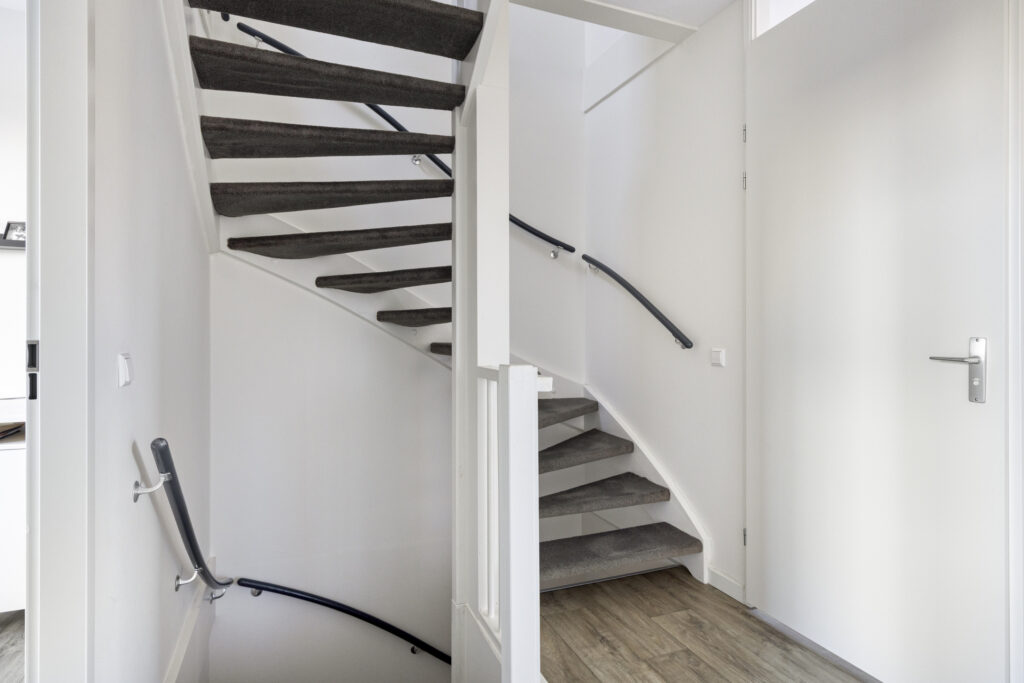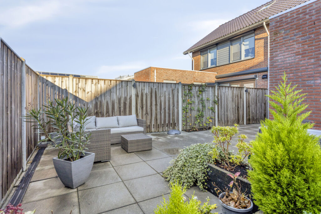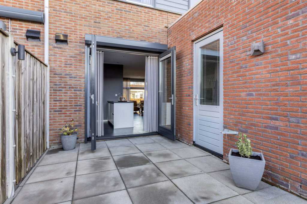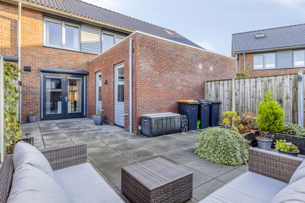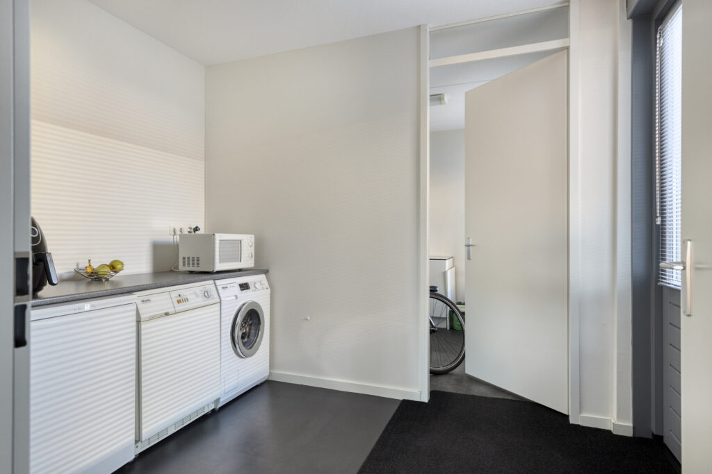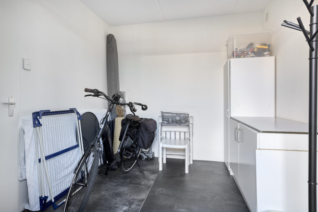 Vanuit de woonkamer stap je door naar de nette bijkeuken met witgoedopstelling en toegang tot het achterterras. Vervolgens loop je door naar de inpandige berging, ideaal voor het stallen van je elektrische fiets. Ook bereik je via deze route eenvoudig de achtertuin.