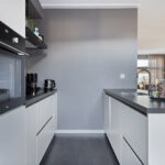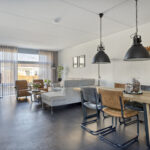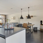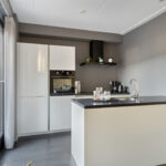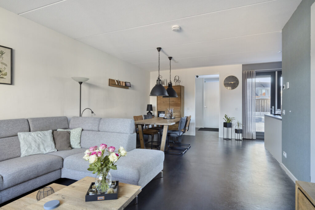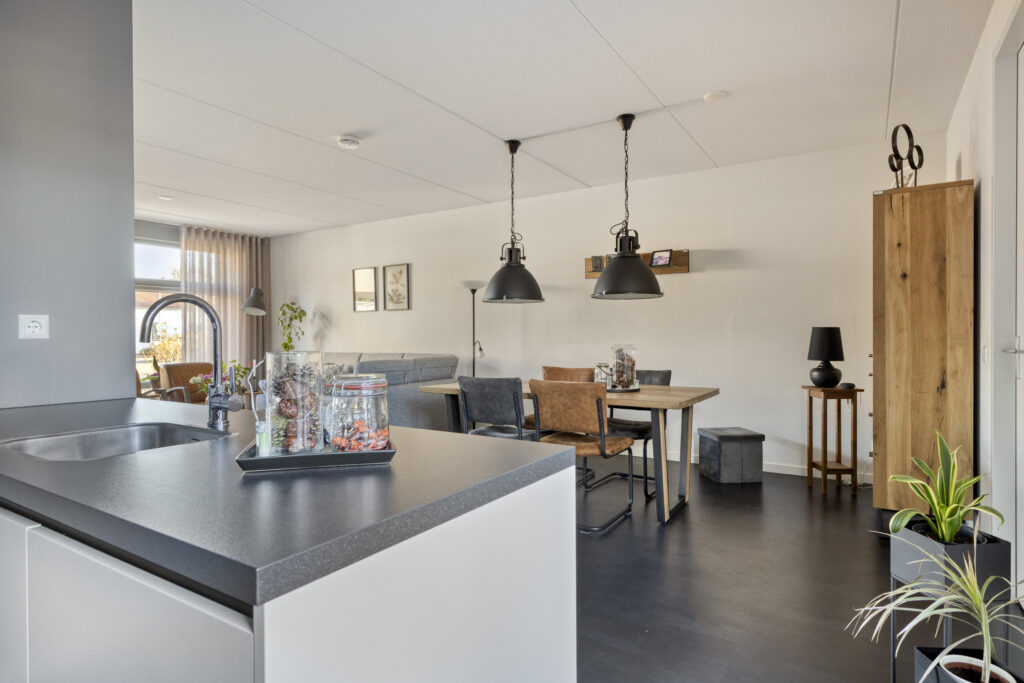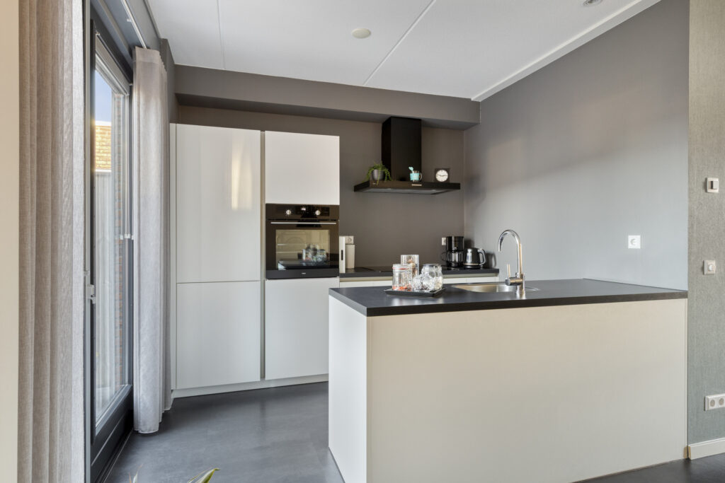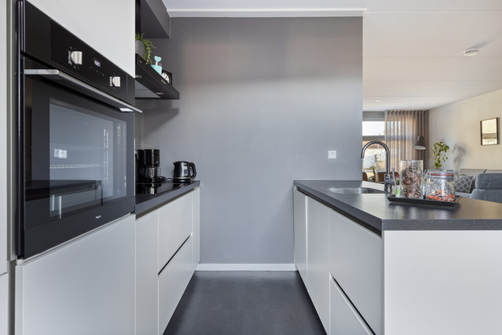 Je loopt door naar de lichte woonkamer, een comfortabele ruimte die uitnodigt om neer te ploffen en te genieten. Aan de achterzijde vind je de open keuken in rechte opstelling, compleet met onder andere een inductiekookplaat, oven, vaatwasser, koel-vriescombinatie, afzuigkap en een spoeleiland.