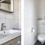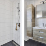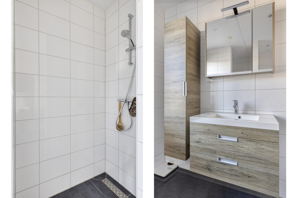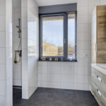 De badkamer is netjes afgewerkt en uitgerust met een moderne inloopdouche en een strak badmeubel.