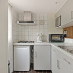 Bij aankomst parkeer je de auto op de centrale parkeerplaats en laad je eenvoudig de koffers uit bij de woning. Je komt binnen in de keuken met een rechte opstelling en eenvoudige afwerking. Als je doorloopt bereik je de tuingerichte woonkamer met plavuizenvloer, radiator en tv-aansluiting. Vanuit hier stap je zo het terras op of neem je de trap naar boven. Op de begane grond ligt ook een slaapkamer en een volledig betegelde badkamer met douche, toilet, radiator, badmeubel en natuurlijke ventilatie.