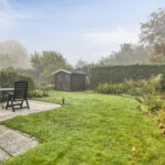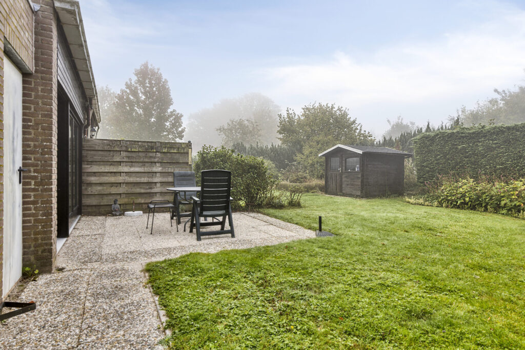 Achter de woning ligt een zonnige tuin met terras en gazon. Op het perceel staat een praktische berging.
