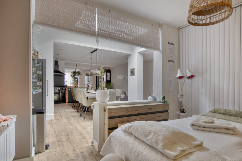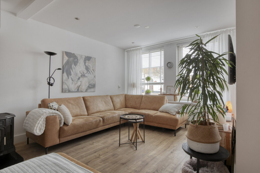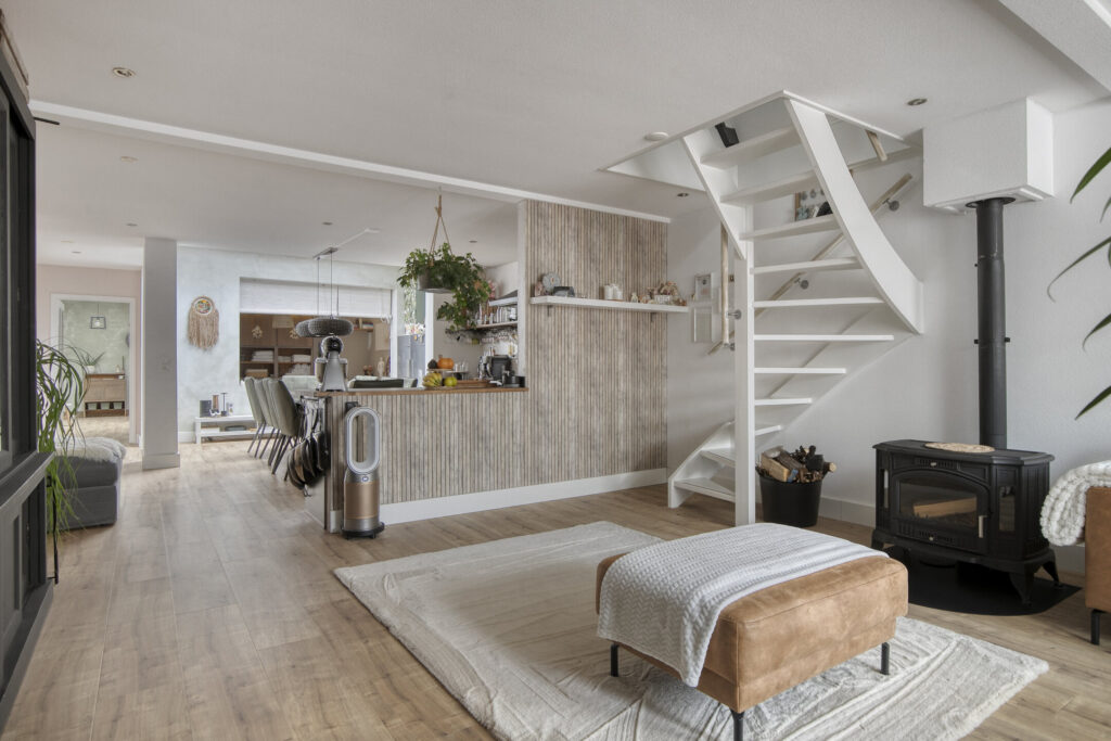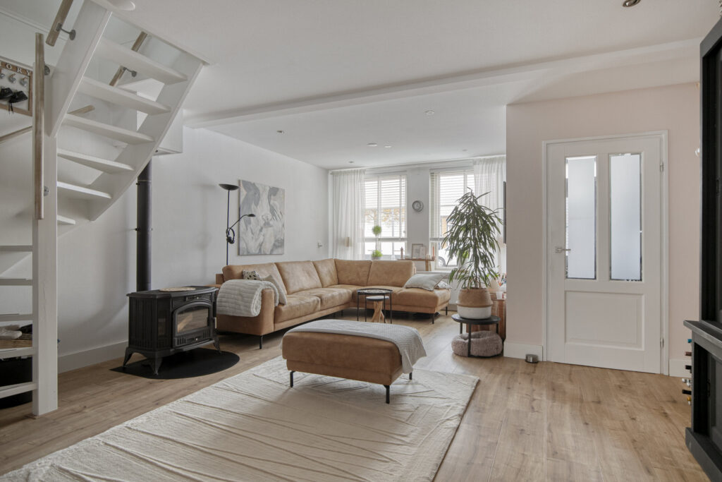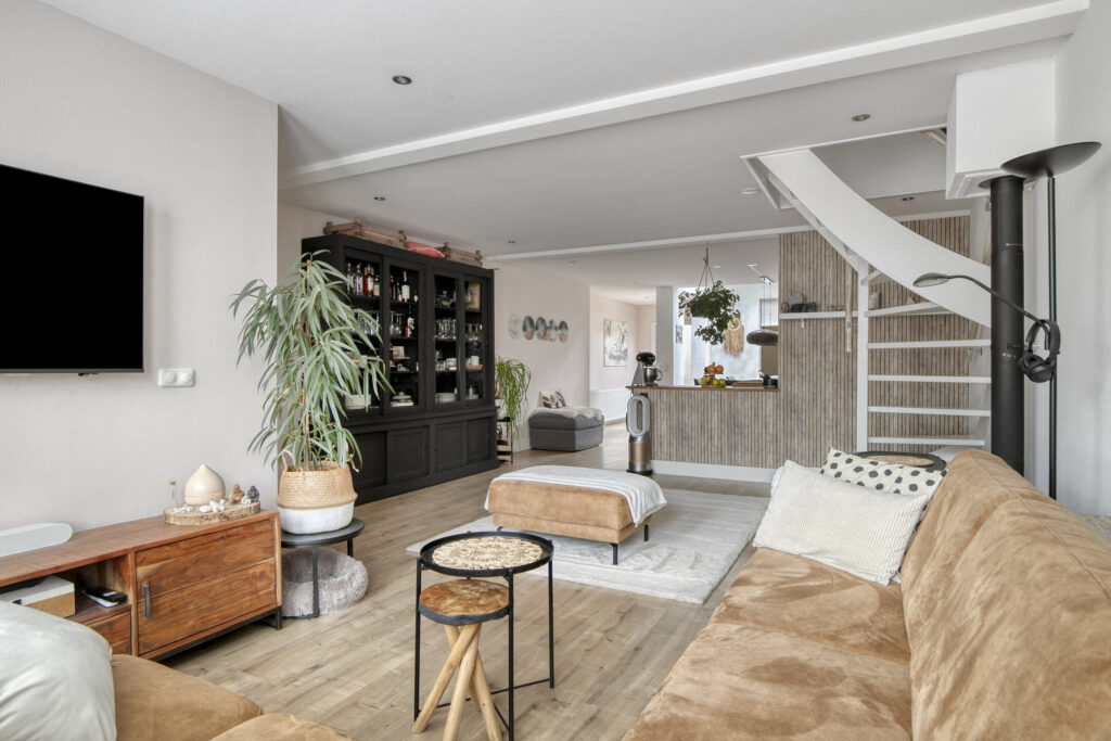 Aan de voorzijde oogt de woning compact, maar zodra je binnenstapt ontdek je een zee van ruimte. De woonkamer voelt direct warm en uitnodigend aan, met een speelse indeling die je telkens opnieuw verrast. Je vindt gezellige hoekjes om samen te zijn en ruime plekken om te ontspannen. Hier woon je ruim, licht en met volop mogelijkheden om het helemaal naar je hand te zetten.