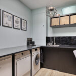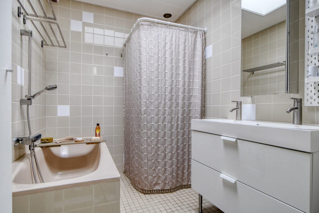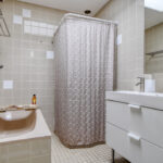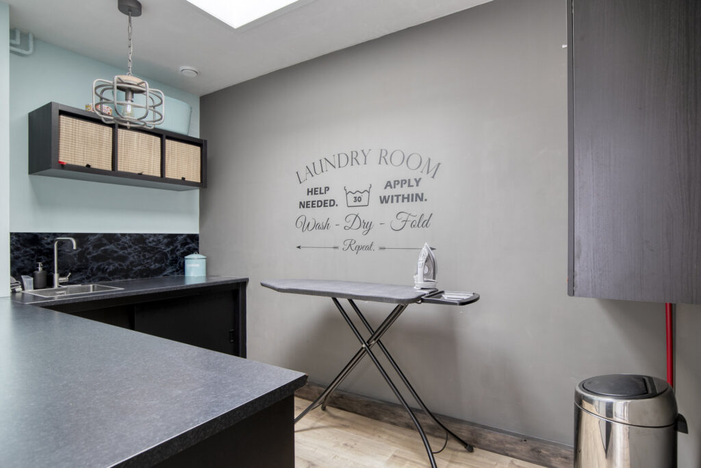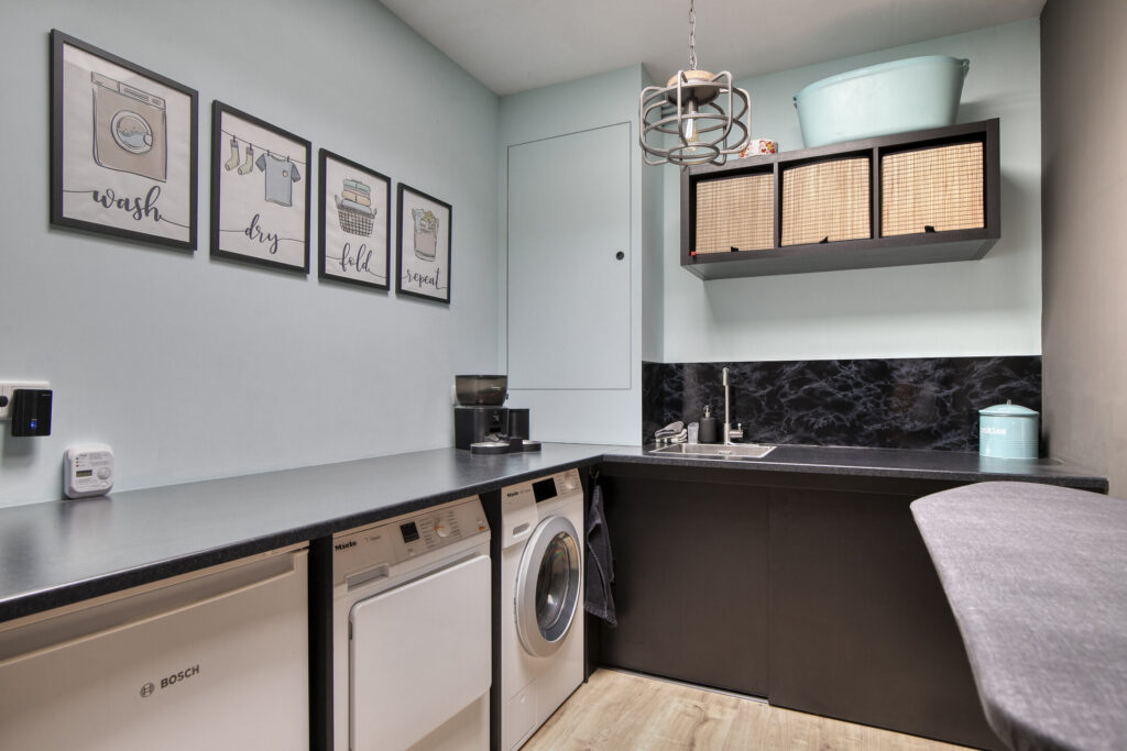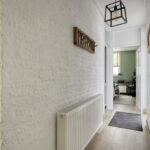 Via de tussenhal bereik je de badkamer (met douche, ligbad en wastafelmeubel), twee ruime slaapkamers, een separaat toilet en een bijkeuken/laundry met extra bergruimte, cv-opstelling en witgoedaansluitingen.