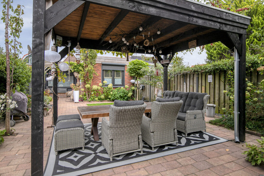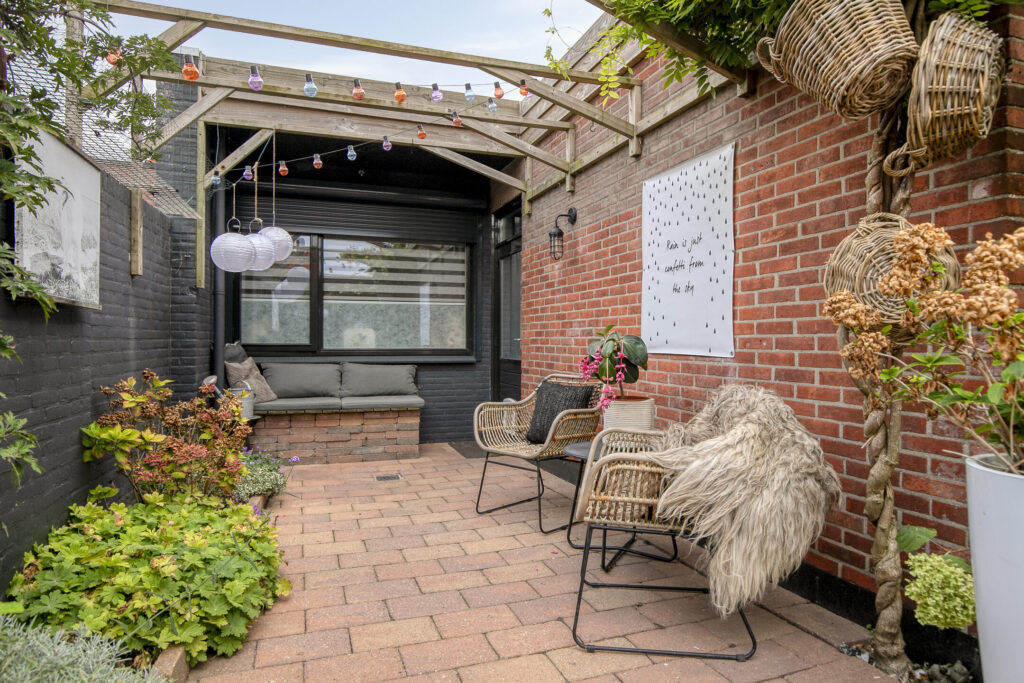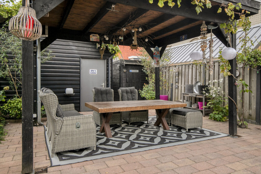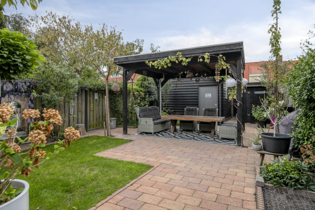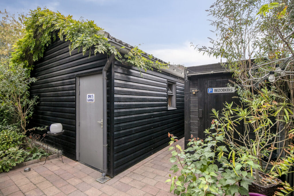 Buiten wacht een sfeervolle achtertuin met zonnige overkapping, terras, een goede bezonning, beplanting en veel privacy. Helemaal achterin staat een ruime schuur/garage (5×11) met elektra, perfect voor klussen, opslag of het stallen van fietsen en gereedschap. Verder is er nog een losse fietsen-/ opbergschuur aanwezig.