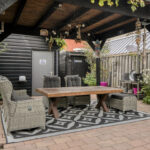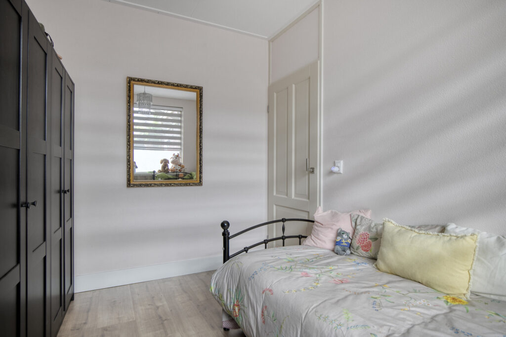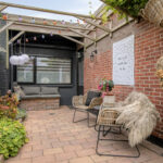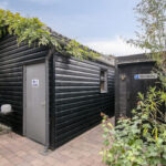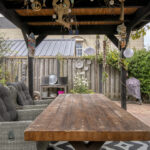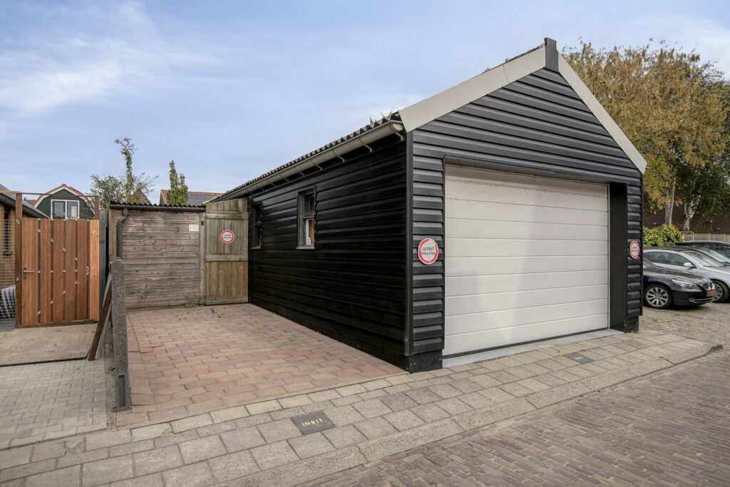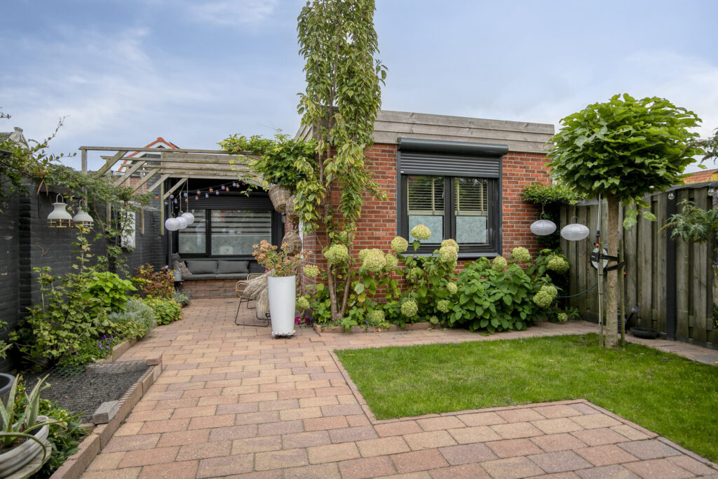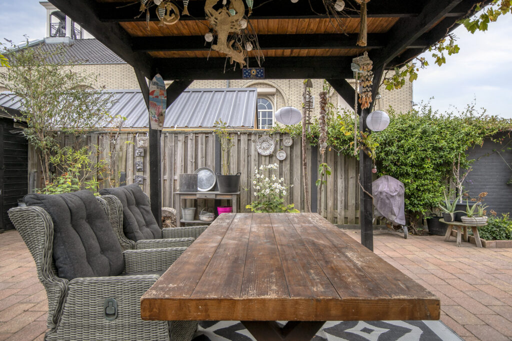 Buiten wacht een sfeervolle achtertuin met zonnige overkapping, terras, een goede bezonning, beplanting en veel privacy. Helemaal achterin staat een ruime schuur/garage (5×11) met elektra, perfect voor klussen, opslag of het stallen van fietsen en gereedschap. Verder is er nog een losse fietsen-/ opbergschuur aanwezig.