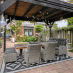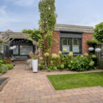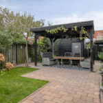 • Sfeervolle achtertuin met terras, bestrating, beplanting en achterom