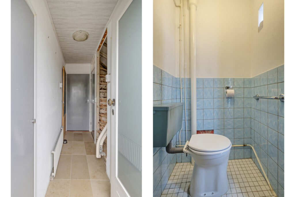 Parkeren doe je makkelijk voor de deur. Via de bestrate voortuin kom je bij de voordeur die toegang geeft tot de woning. In de entree/hal, met plavuizenvloer, radiator en trapkast voor extra bergruimte, kom je tevens de toiletruimte tegen.