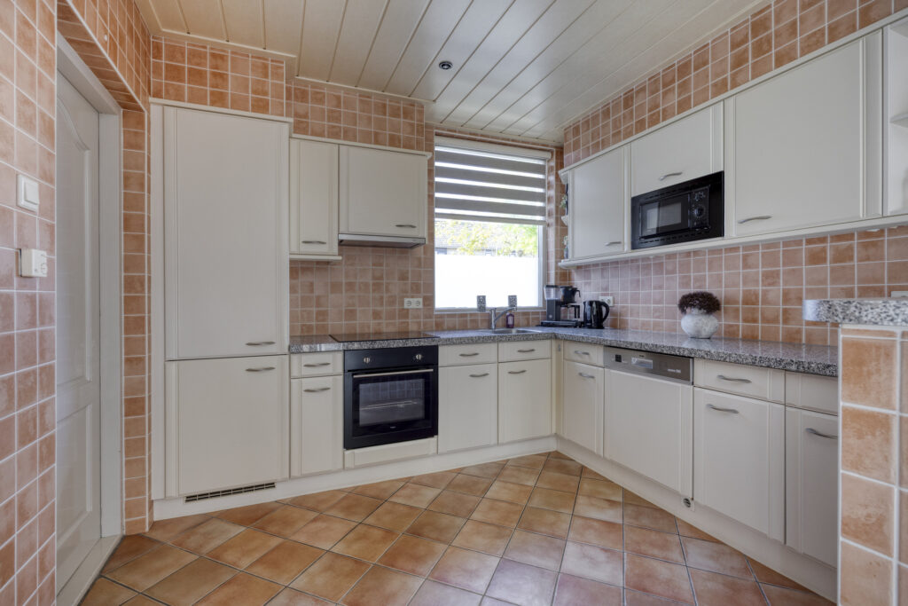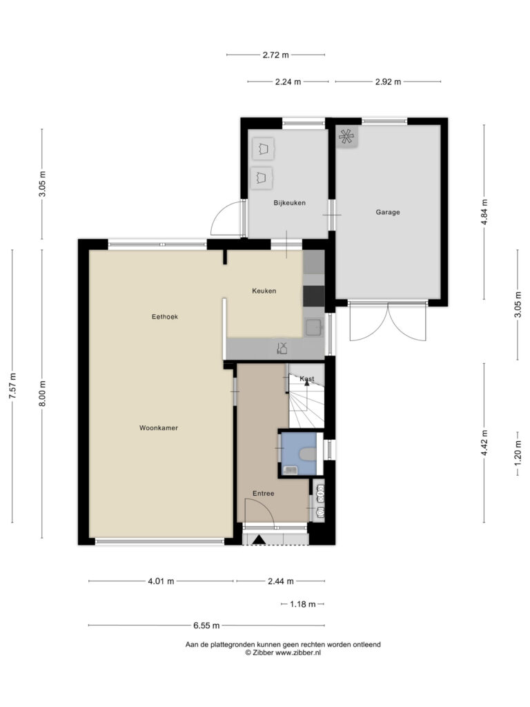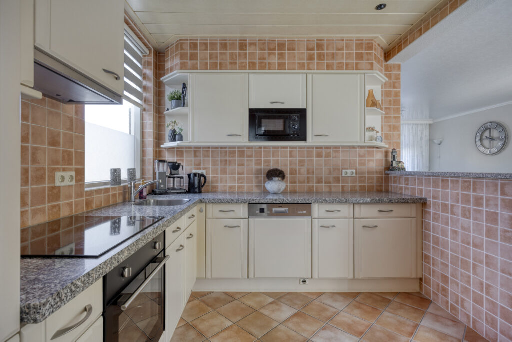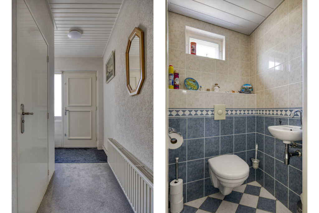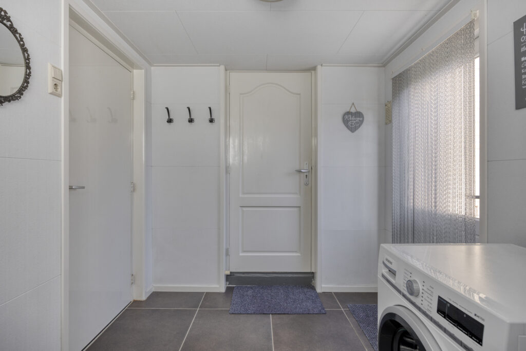 Via de voortuin bereik je de voordeur. In de hal vind je de meterkast, trapkast, radiator en een betegeld toilet met fonteintje. Vanuit de hal loop je door naar de lichte woonkamer. De grote raampartijen zorgen voor veel daglicht en geven een ruimtelijk gevoel. Aangrenzend ligt de halfopen keuken in hoekopstelling, compleet met koelkast, vaatwasser, afzuigkap, magnetron en keramische kookplaat. Vanuit de keuken stap je de bijkeuken in, met aansluitingen voor witgoed. Hier vind je ook de doorgang naar de garage en de tuin.