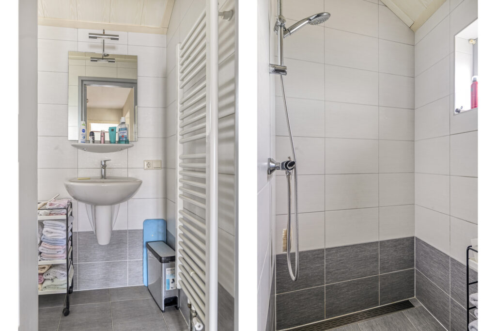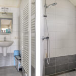 Op de eerste verdieping vind je drie slaapkamers met rolluiken en radiatoren. De doucheruimte is geheel betegeld en heeft een inloopdouche, wastafel en handdoekenradiator.