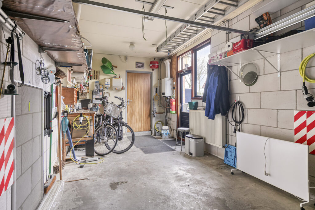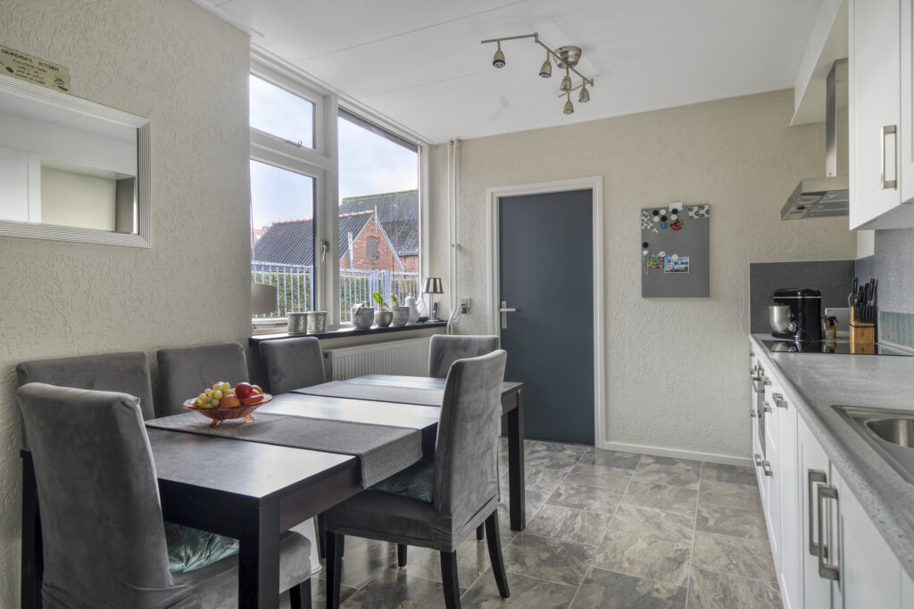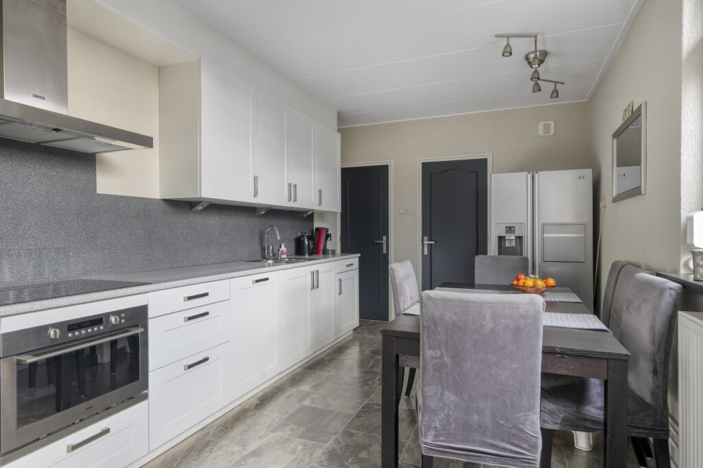 De woonkeuken met trapkast heeft een rechte keukenopstelling met een inductiekookplaat, afzuigkap, combi-oven, vaatwasser en voldoende plek voor een eettafel. Via de keuken kom je in de bijkeuken met een witgoedaansluiting en een tuindeur. Vanuit de bijkeuken toegang tot de inpandige garage. De garage is voorzien van de Cv-opstelling, wateraansluiting, radiator, tuindeur en een elektrische paneeldeur.