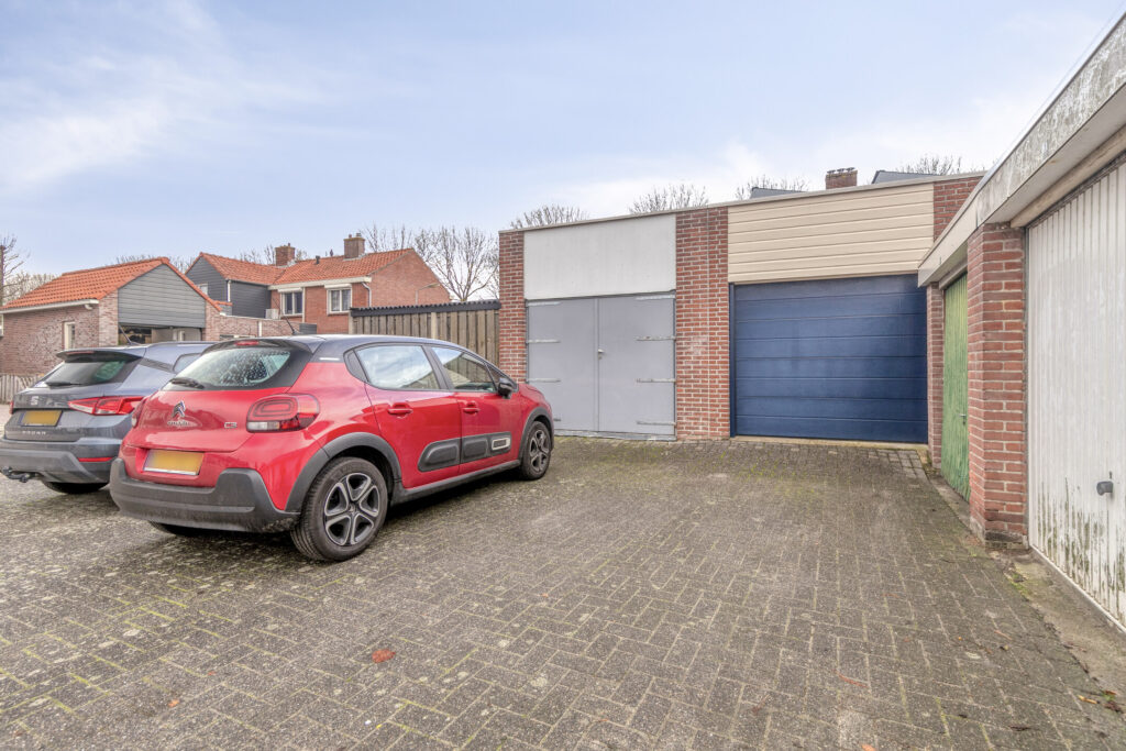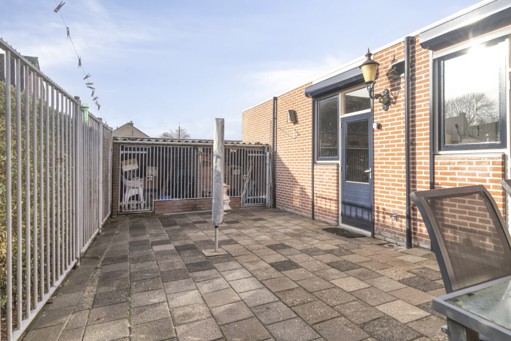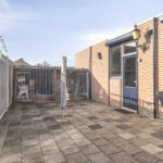 De achtertuin is geheel betegeld, heeft een goede bezonning, buitenverlichting en een vrije achterom.