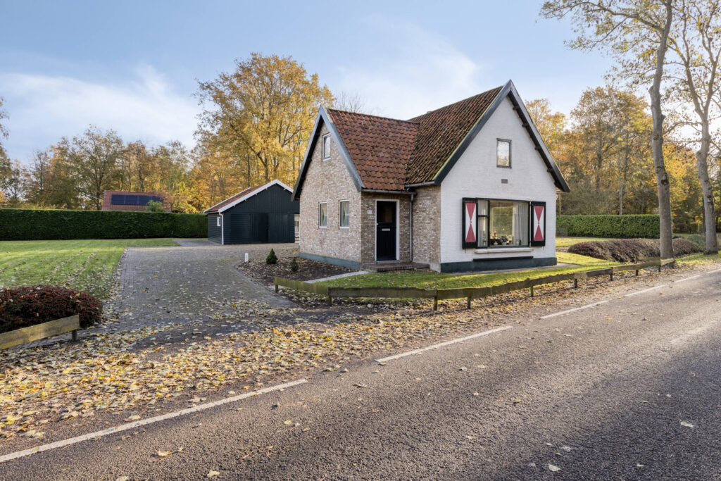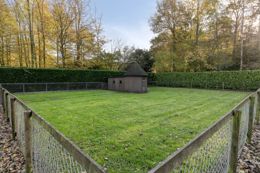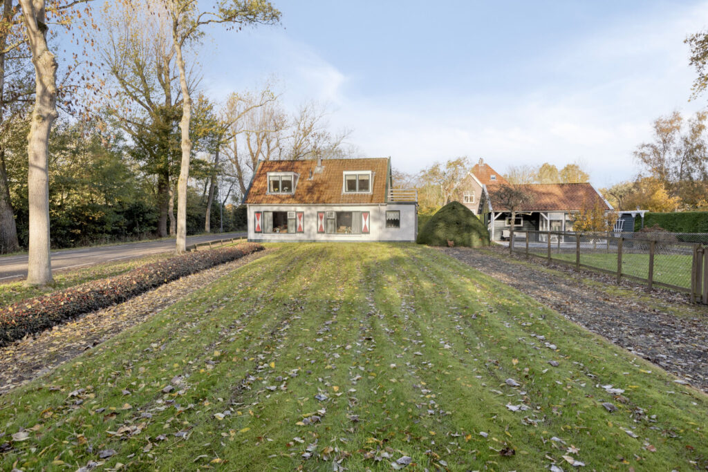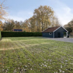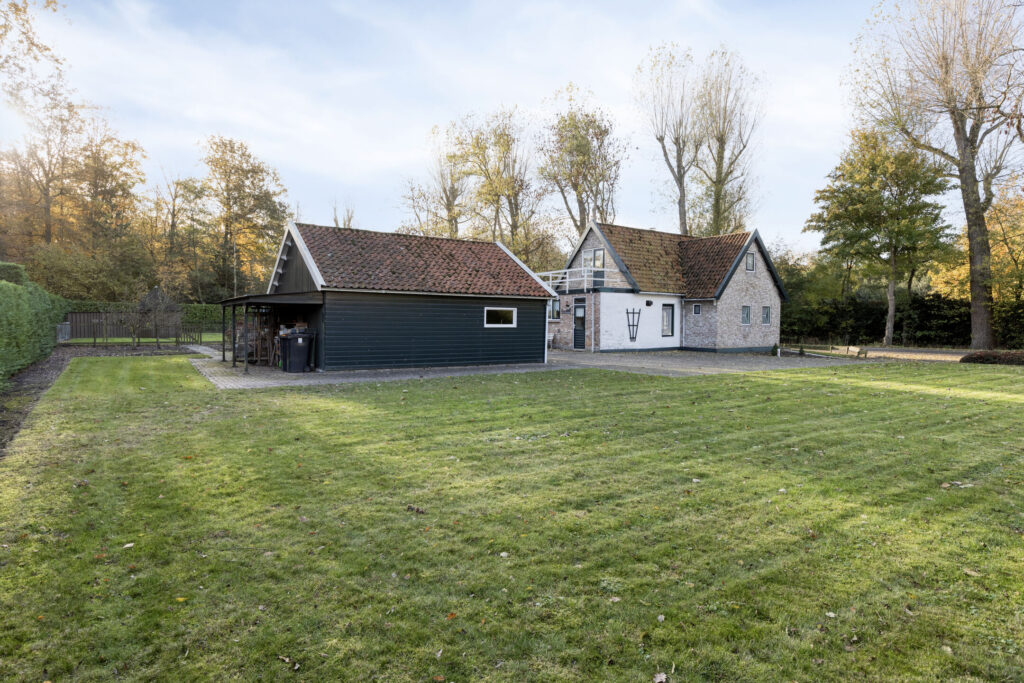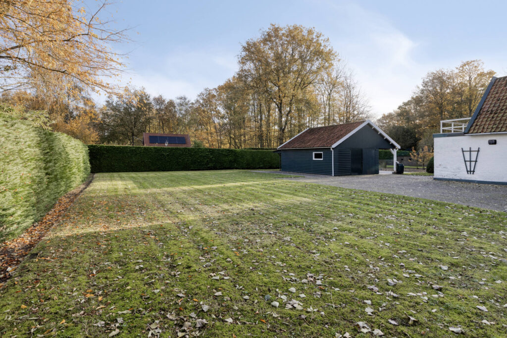 De oprit biedt ruimte voor meerdere auto’s en leidt naar de ruime schuur. Het gazon, de borders en de kleinveeweide geven het geheel een landelijke charme. Voor wie houdt van tuinieren, dieren of buitenleven is dit een paradijs. Het perceel is overzichtelijk en tegelijk vol mogelijkheden voor uitbreiding, een moestuin of een sfeervolle zitplek.