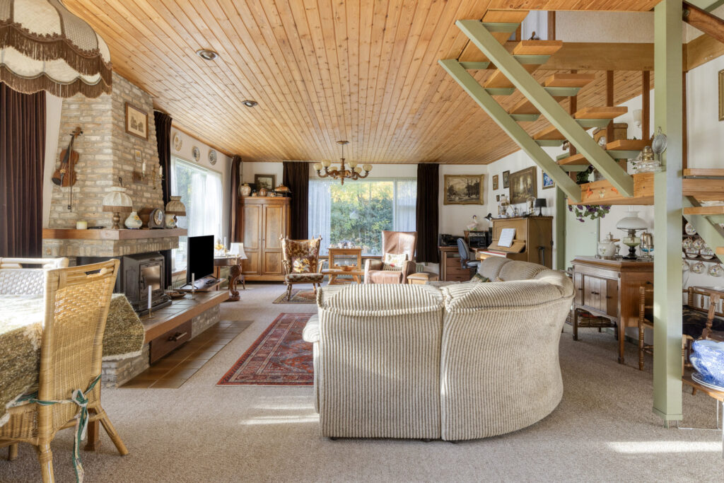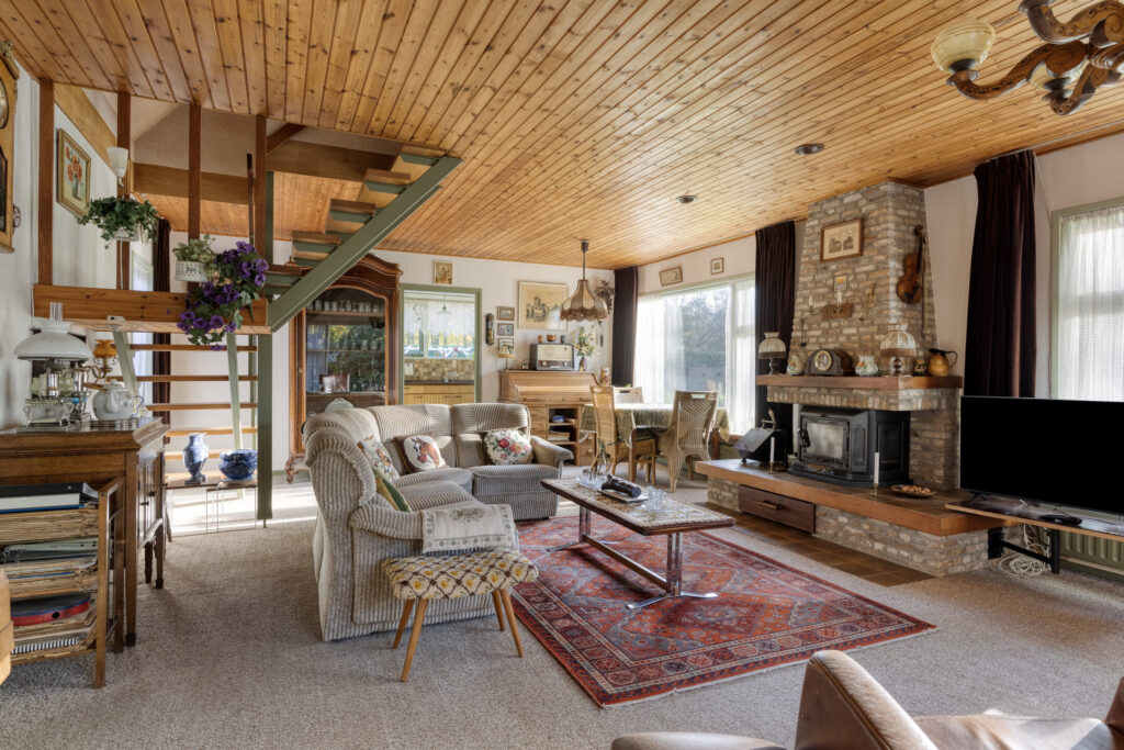 Via de ruime hal aan de voorzijde stap je binnen in een huis met karakter. In de hal vind je de meterkast, een radiator en een toiletruimte met fonteintje. Vanuit de hal loop je door naar de woonkamer, waar de grote raampartijen direct opvallen. Ze zorgen voor veel lichtinval en een vrij uitzicht over het perceel. De woonkamer heeft radiatoren, een gezellige schouwpartij (met haard) en aansluitingen voor tv en telefoon.