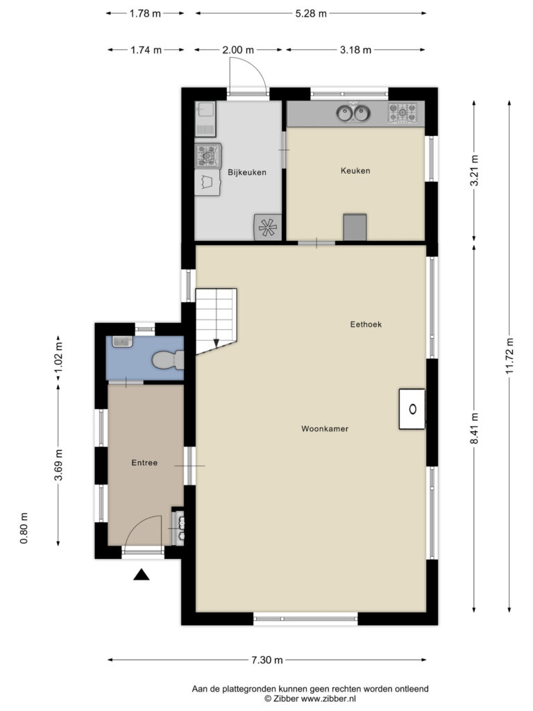 Aangrenzend bevindt zich de bijkeuken met tuindeur, extra keukenblok, gootsteen en aansluitingen voor de wasmachine.