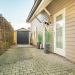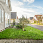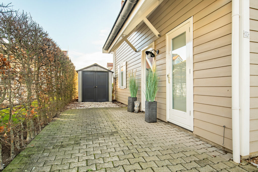 Rondom de woning ligt een verzorgde tuin met een zonnig terras, gazon en groene haag. De tuin is bereikbaar via een vrije achterom. Aan de voorzijde is voldoende ruimte voor parkeren op eigen terrein.