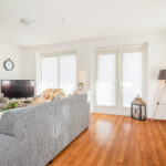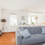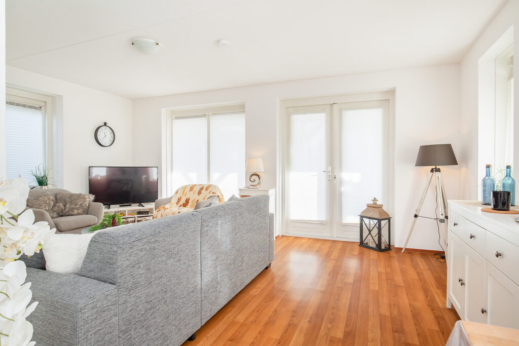 De lichte woonkamer is tuingericht en voorzien van grote raampartijen en openslaande deuren naar het terras en de veranda – perfect om binnen en buiten met elkaar te verbinden.