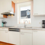 De open keuken bevindt zich aan de voorzijde en is uitgevoerd in rechte opstelling met o.a. een kookplaat, afzuigkap, vaatwasser en koelkast.