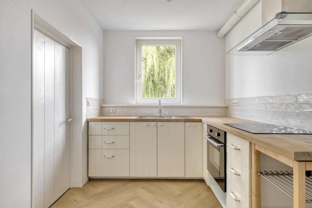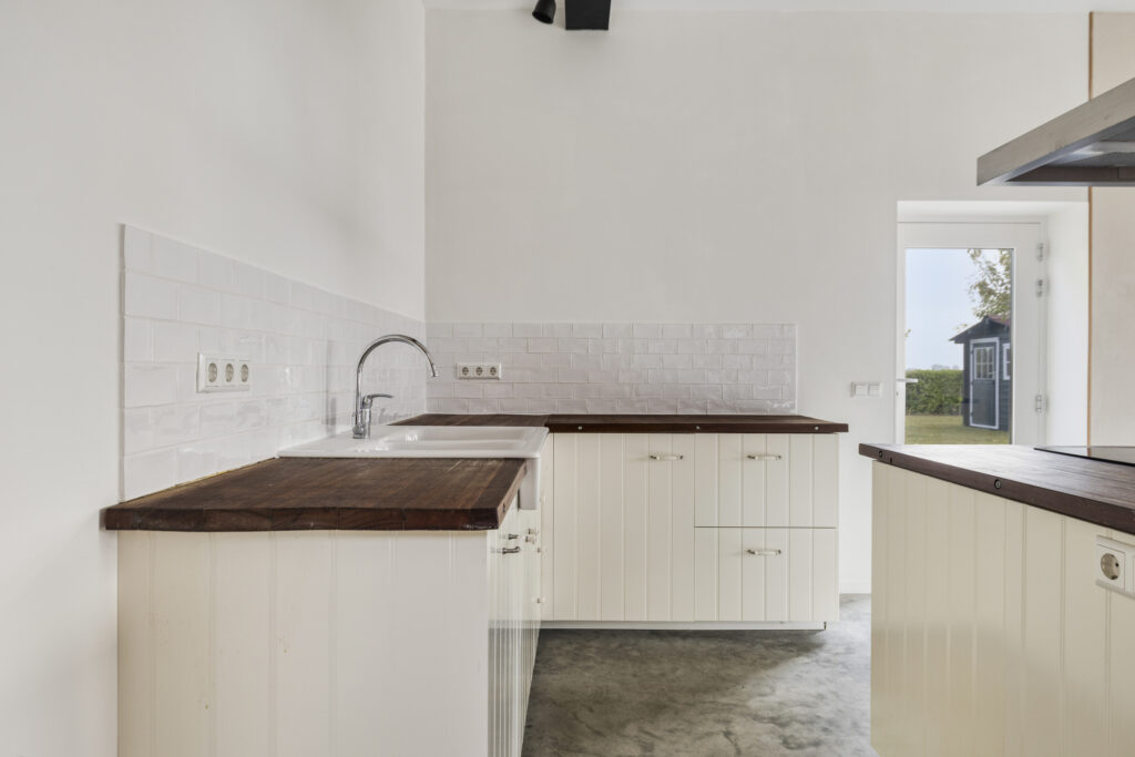 De entree ligt aan de zijkant. Vanuit de hal stap je (1) de lichte woonkamer binnen, compleet met houtkachel en vaste kast en (2) de keukenruimte. Het keukenblok staat in een hoekopstelling met apparatuur en kastruimte. Vanuit de keuken toegang tot ruim opgezette bijkeuken met PVC-vloer, witgoedaansluiting en openslaande deuren naar de oprit. Vanuit de bijkeuken bereik je de badkamer met douche, ligbad, toilet en wastafelmeubel.