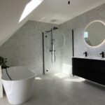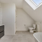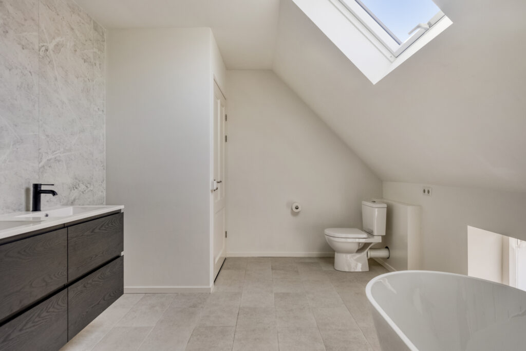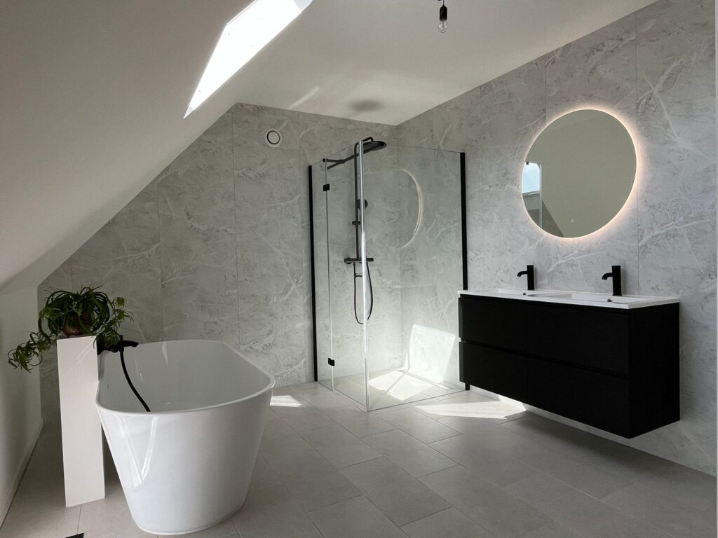 Op de eerste verdieping tref je een ruime overloop die ook als werkkamer gebruikt kan worden. Verder zijn er drie slaapkamers en een luxe badkamer, volledig vernieuwd in 2025. Deze badkamer beschikt over vloerverwarming, een inloopdouche (met stortkop), ligbad, dubbele wastafel en toilet.