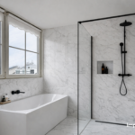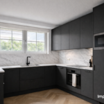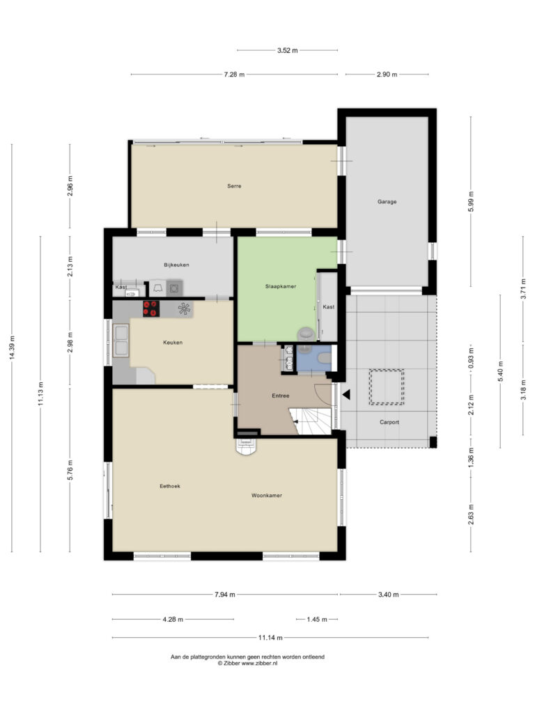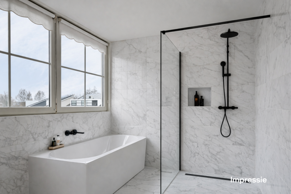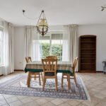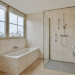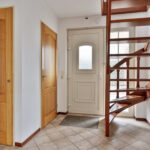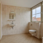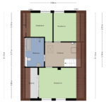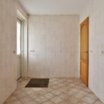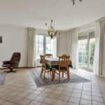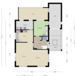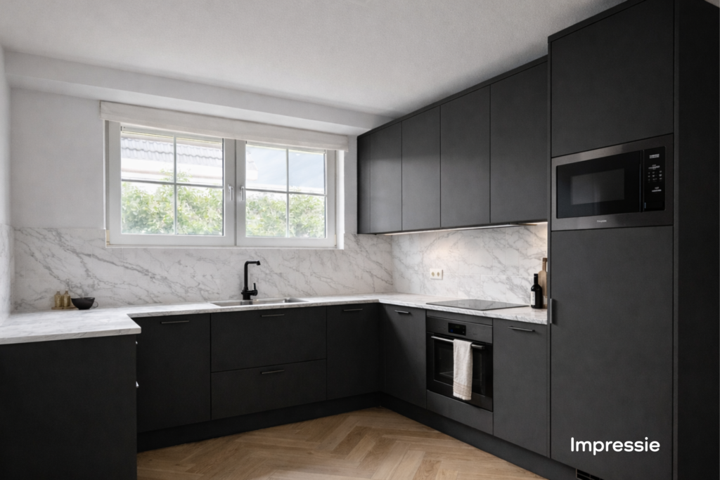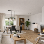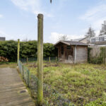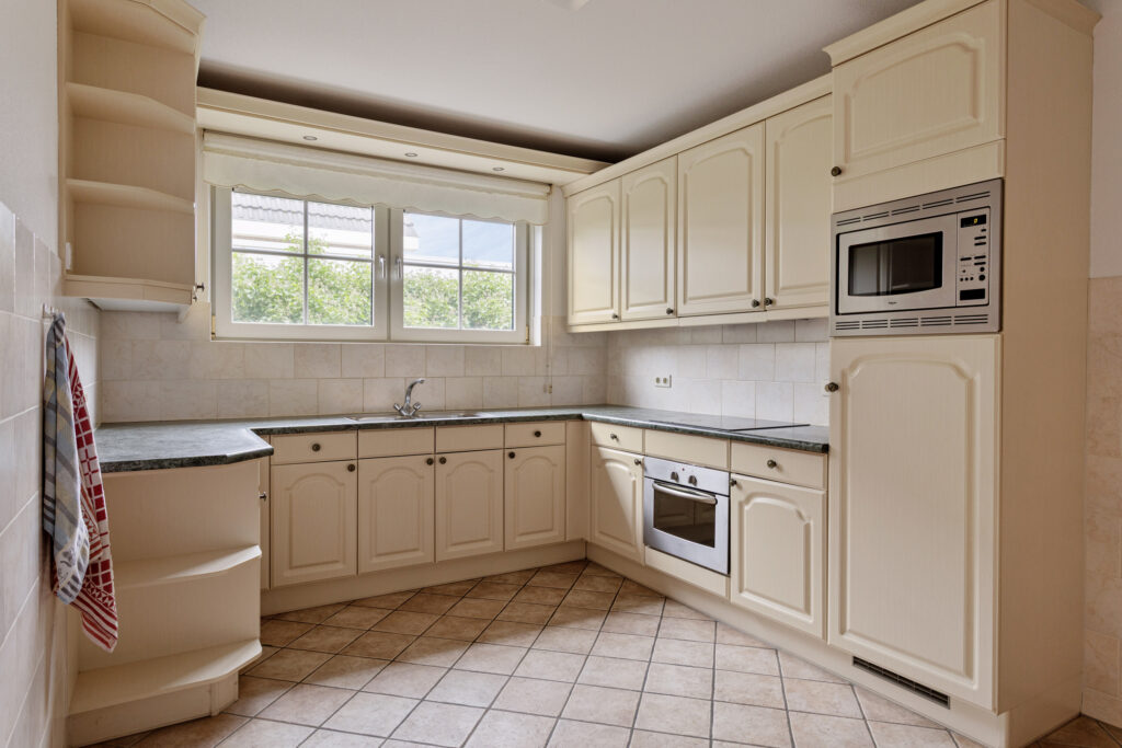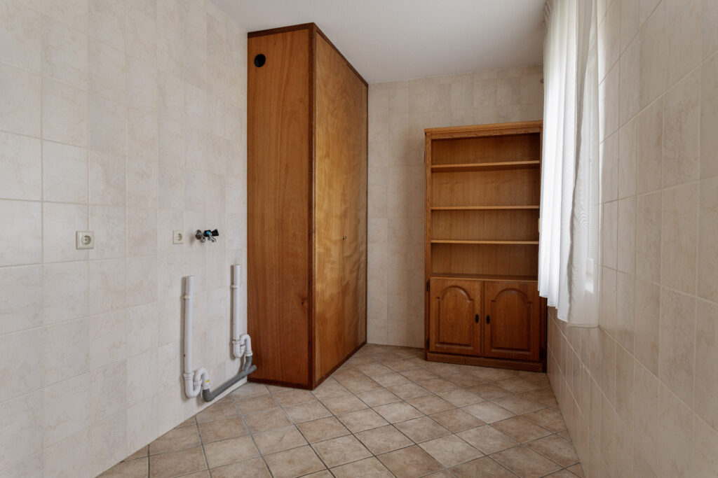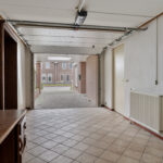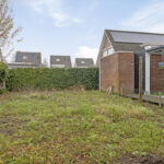 De keuken sluit naadloos aan op de woonkamer en heeft een praktische U-vormige opstelling. Vanuit de keuken bereik je de bijkeuken met aansluitingen voor wasmachine en droger. Deze ruimte geeft toegang tot de tuinkamer, die met schuifdeuren direct grenst aan de achtertuin. De slaap-/werkkamer op de begane grond ligt naast de garage, die mogelijkheden biedt om er een badkamer te realiseren, waardoor volledig gelijkvloers wonen mogelijk wordt.