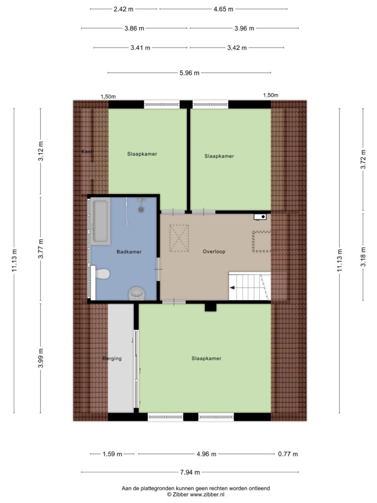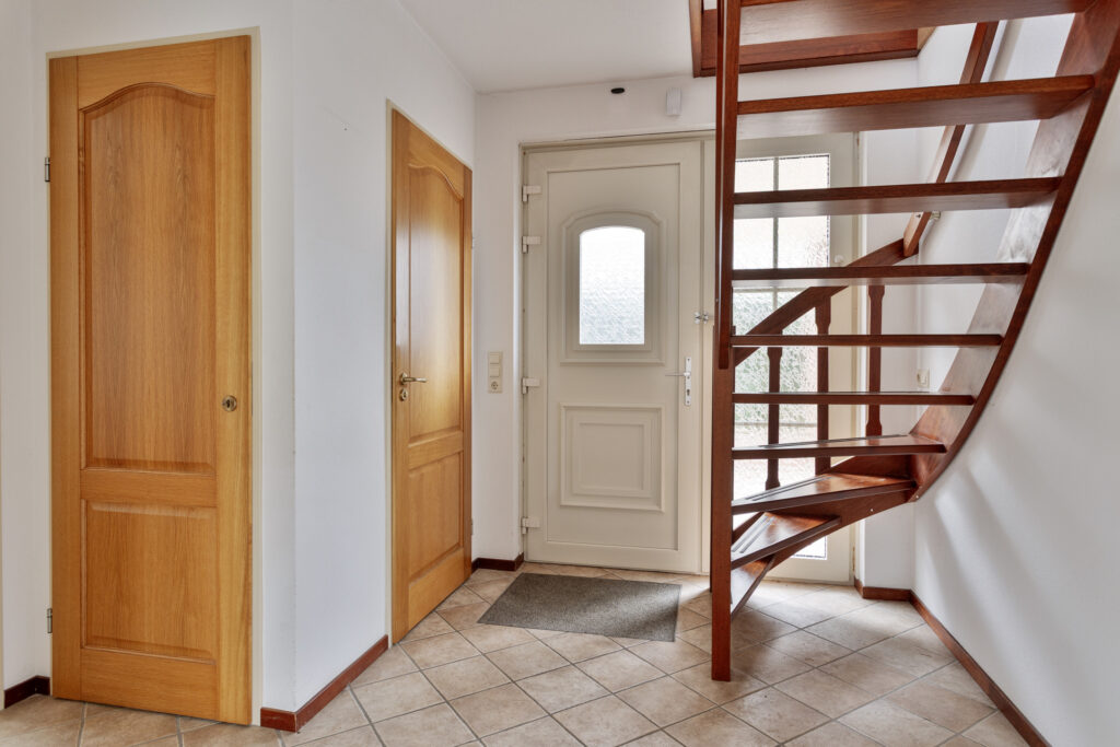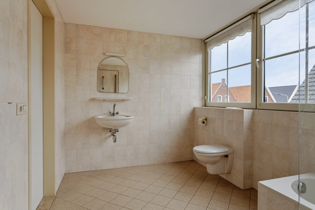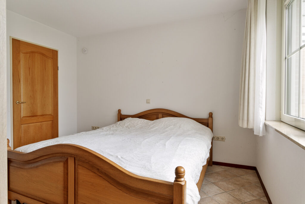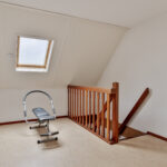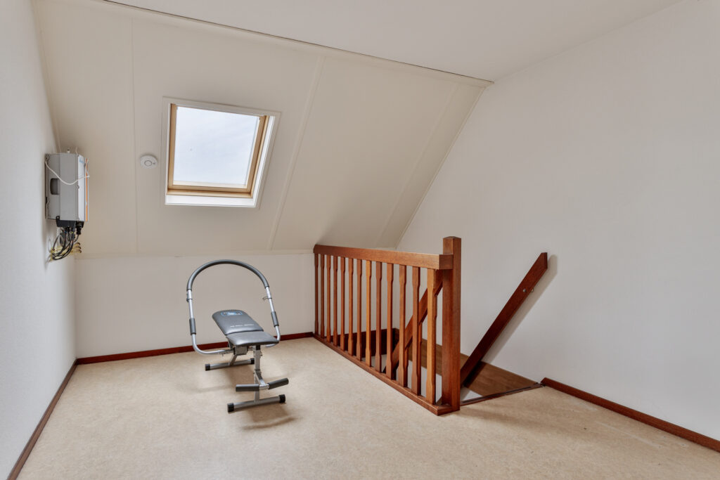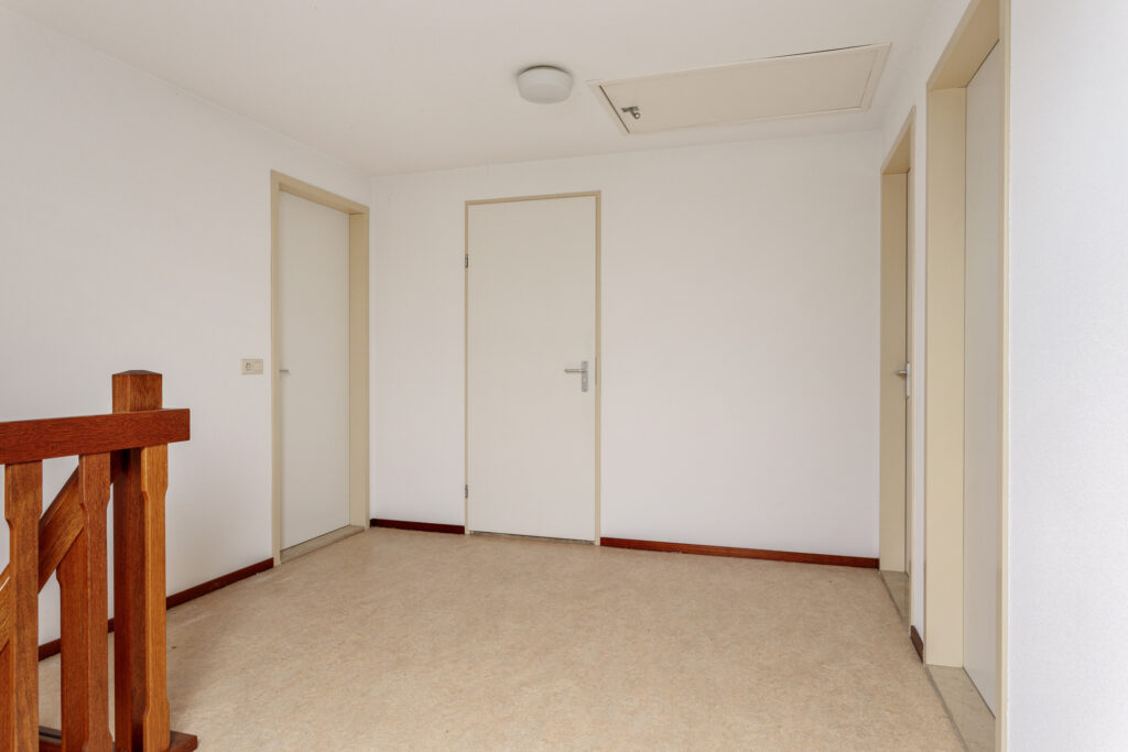 Vanuit de hal leidt de trap naar de eerste verdieping. De ruime overloop geeft toegang tot drie slaapkamers en biedt bovendien ruimte voor een computer- of werkhoek. De slaapkamer aan de voorzijde is royaal en beschikt over een vaste kastenwand. Alle kamers zijn voorzien van rolluiken. Vanaf de overloop bereik je verder de badkamer, uitgerust met een wastafel, ligbad, toilet en inloopdouche, en de bevloerde bergzolder.