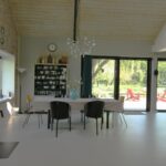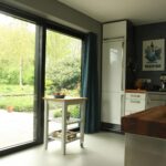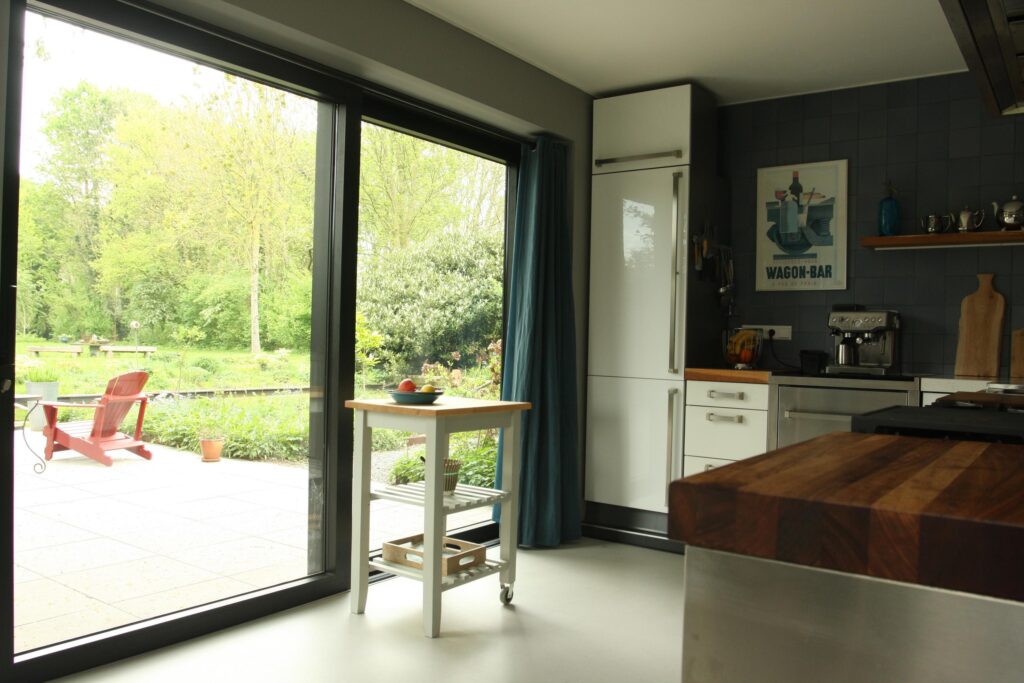 Binnen kom je in een ruime, lichte woonkamer met een open keuken. De zes meter brede schuifpui zorgt voor een levend groen schilderij. De woonkamer biedt genoeg ruimte voor een royale zithoek en een grote eettafel waar je met familie en vrienden gezellig kan tafelen. De keuken sluit hier naadloos op aan en is praktisch ingericht, met voldoende werk- en bergruimte.